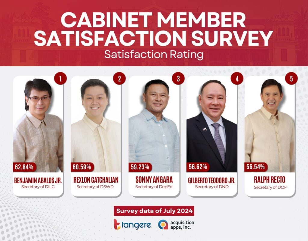 • Interior and Local Government Secretary Benjamin Abalos Jr. received the highest satisfaction rating at 62.84 percent, reflecting strong public approval for the agency’s efforts in tackling drug-related issues and corruption.