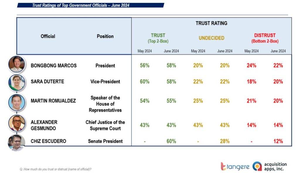 President Marcos’ satisfaction and trust ratings continue to rise, while Vice President Sara Duterte’s ratings have fallen following her resignation from the Cabinet, based on a Tangere survey conducted from June 18 to 21.