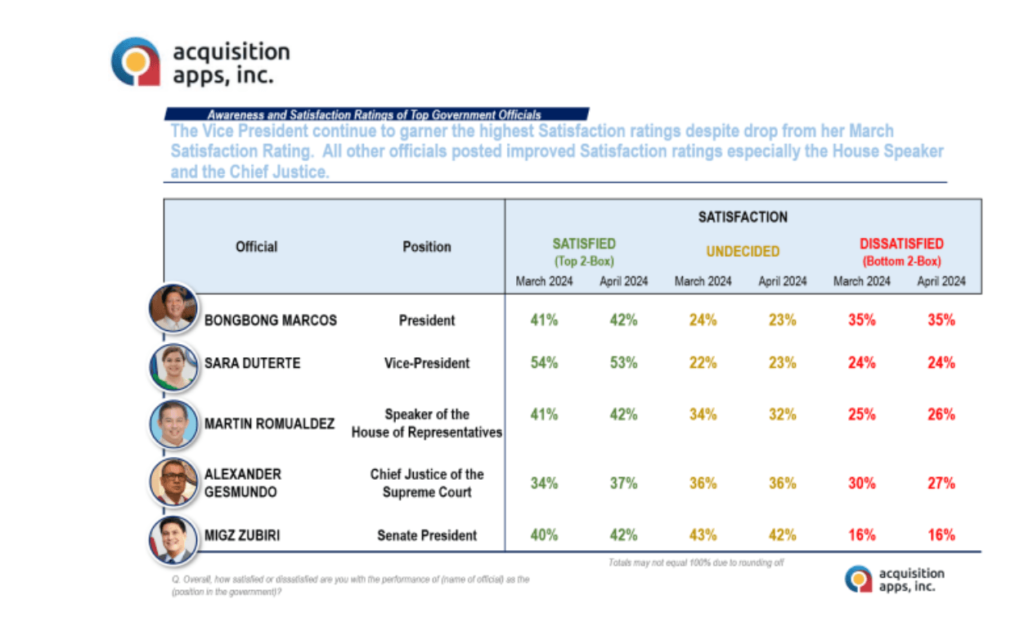 In the survey, Romualdez got a satisfaction percentage of 42 percent (41 percent in March) and 53 percent (52 percent in March) trust ratings.