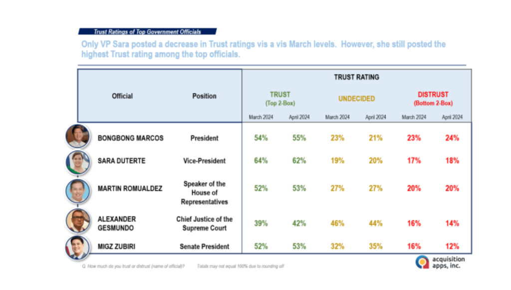 Moreover, Gesmundo attained a 37 percent satisfaction rating (34 percent in March) and a 42 percent trust rating (39 percent in March).
